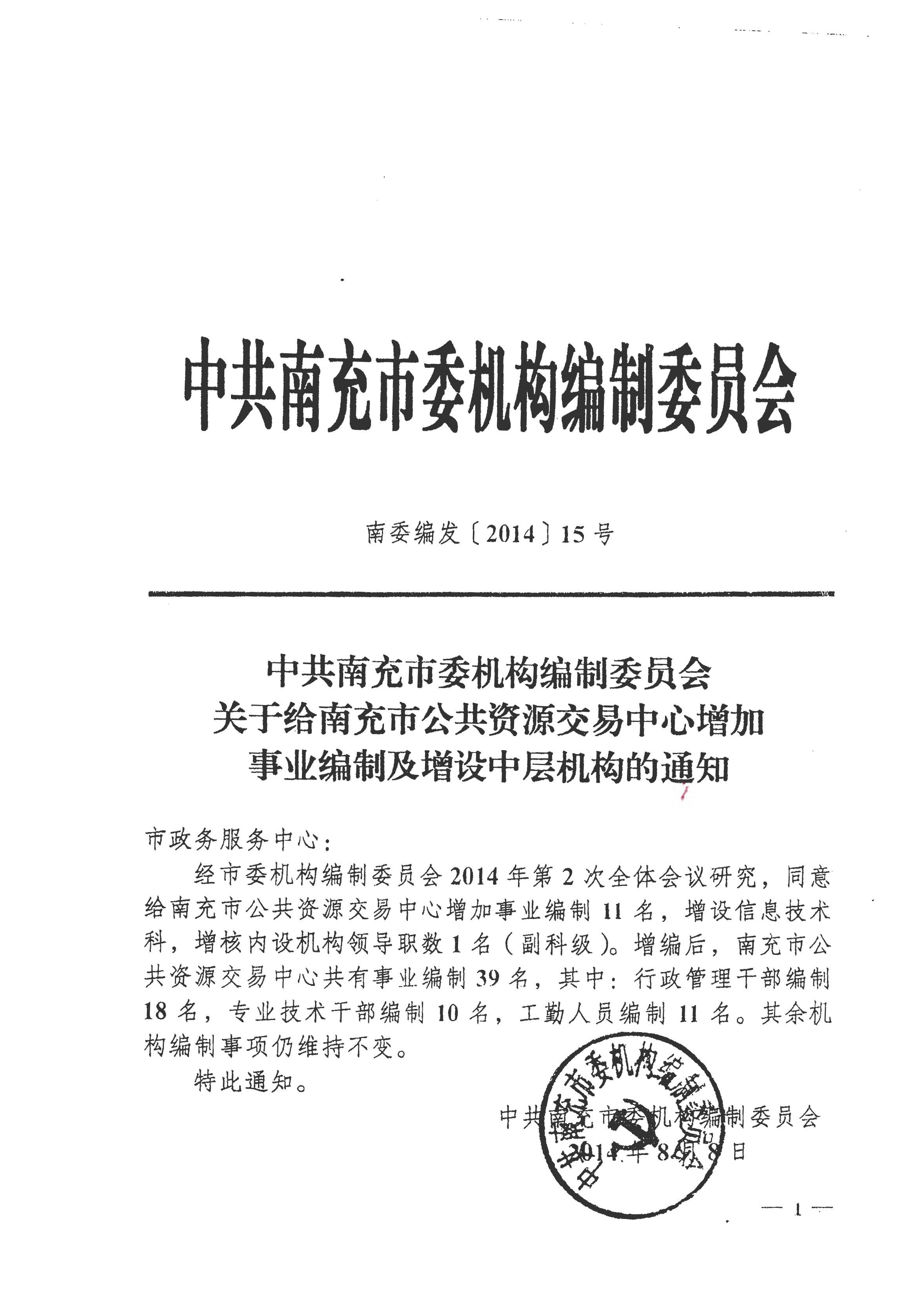 中共南充市委機(jī)構(gòu)編制委員會(huì)關(guān)于給南充市公共資源交易中心增加事業(yè)編制及增設(shè)中層機(jī)構(gòu)的通知