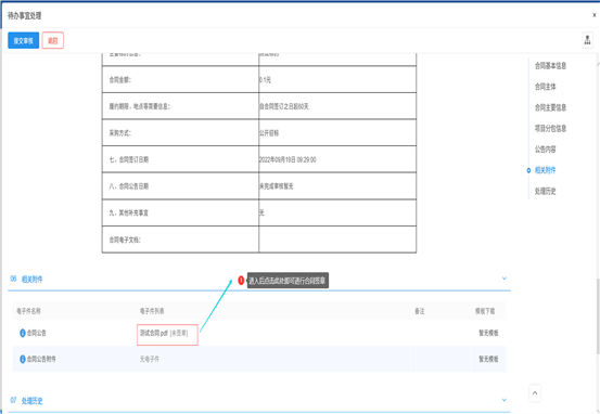 采購單位簽署完成提交流程后中心人員即可在代辦事宜中收到代辦消息,點擊進入后即可查驗合同簽署內(nèi)容。