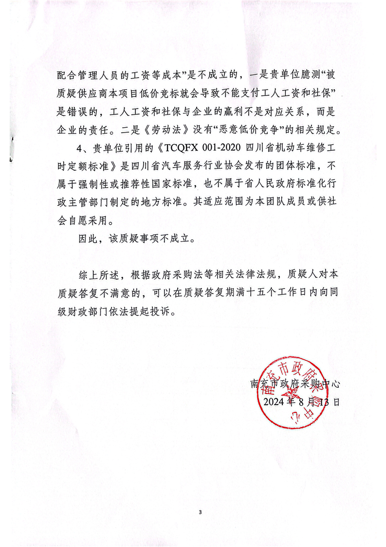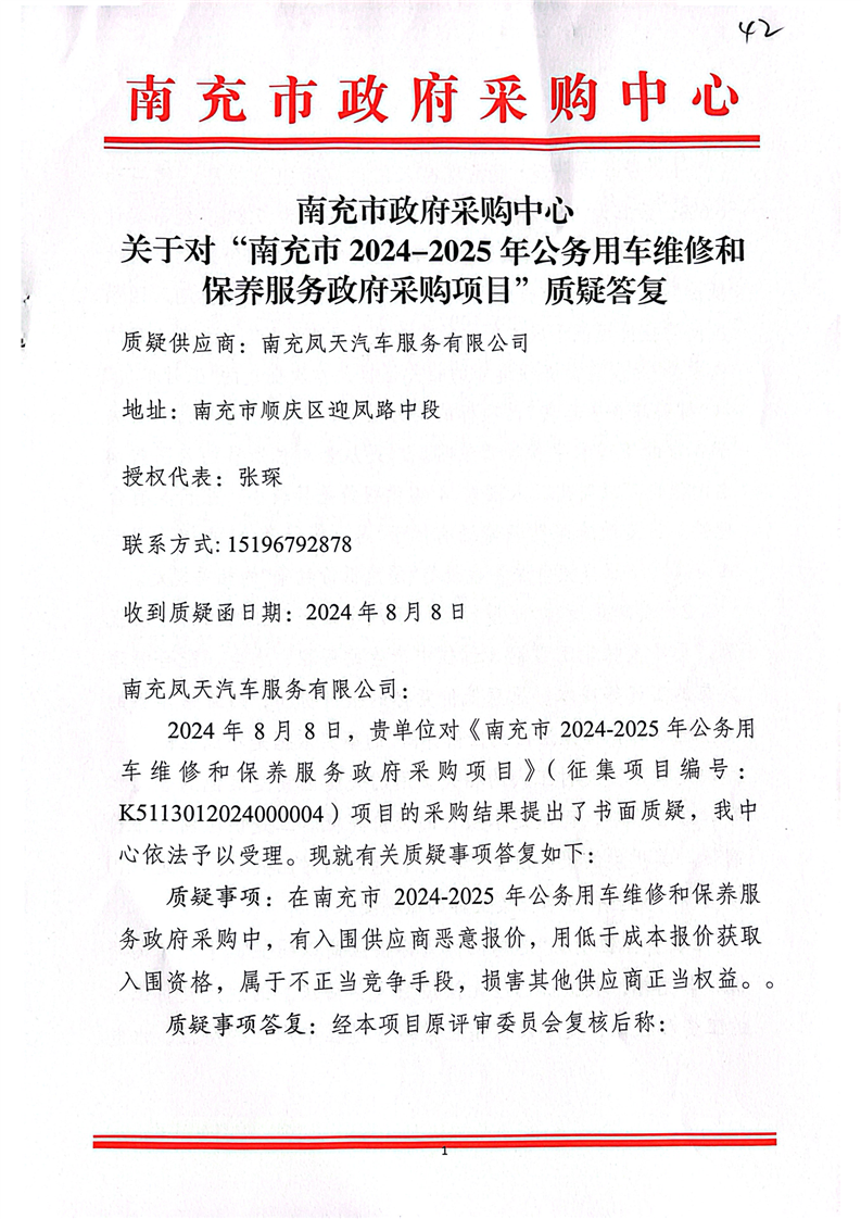 南充市政府采購中心關(guān)于對“南充市2024-2025年公務(wù)用車維修和保養(yǎng)服務(wù)政府采購項(xiàng)目”質(zhì)疑答復(fù)(南充鳳天汽車服務(wù)有限公司)