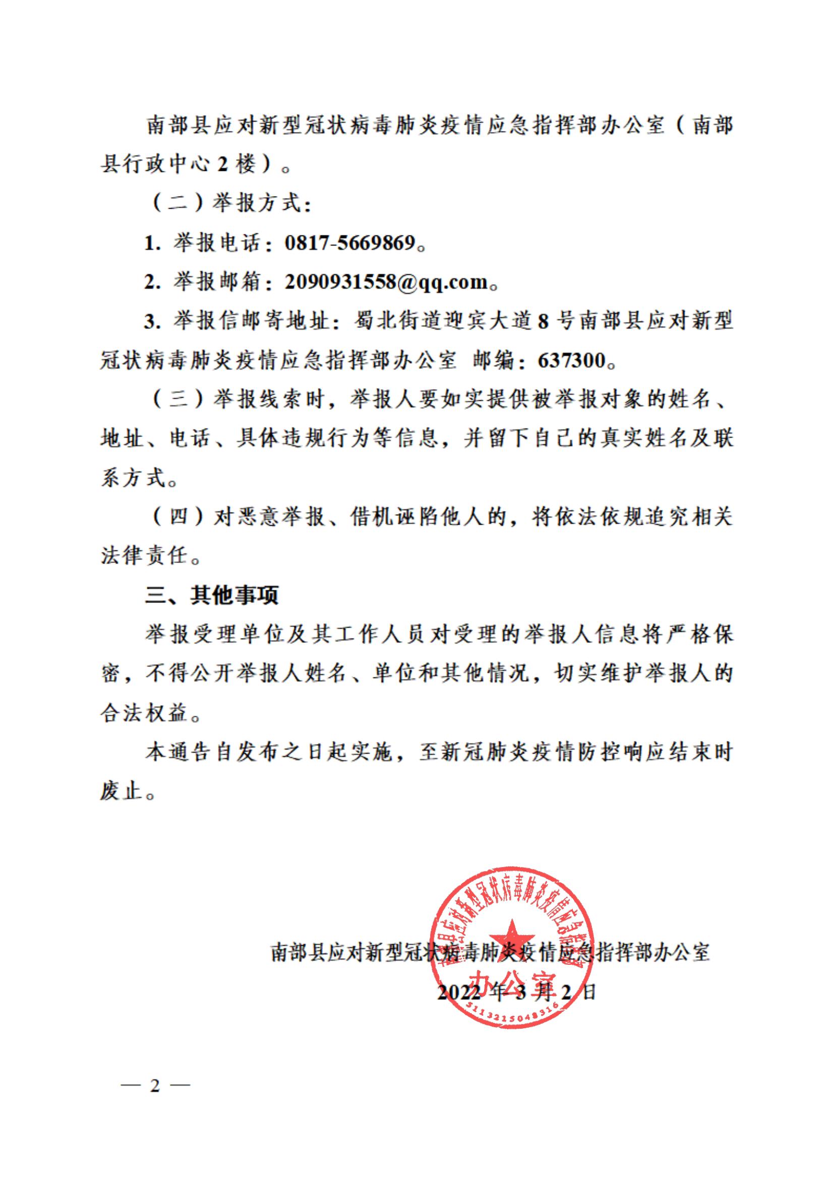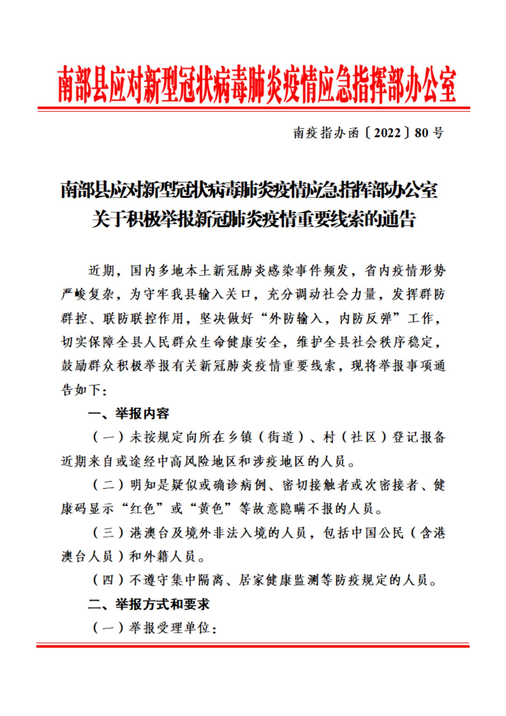 南部縣關(guān)于積極舉報(bào)新冠肺炎疫情重要線索的通告