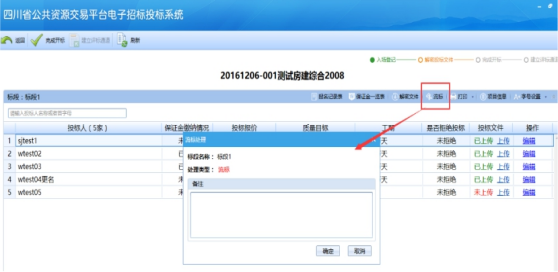 注:如遇特殊情況,需要投標人現(xiàn)場遞交投標文件,請在開標一欄表中選擇該投標人,然后上傳文件。