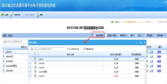 點擊“報名記錄表”,可以查看當前標段有哪些投標人參與了報名,這里上傳投標文件的會默認加入到“開標記錄表”中,其他投標人如果需要加入,請在該投標人前面打鉤,然后點擊“加入到開標記錄表”;