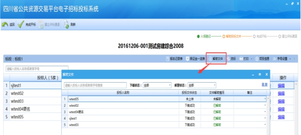 點擊“解密文件”進行投標文件解密操作: