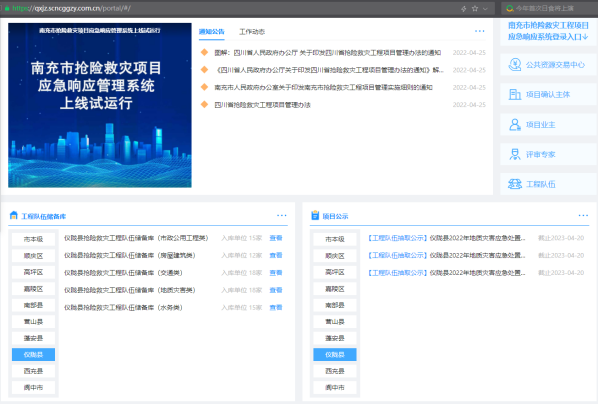 2023年4月20日,按照《儀隴縣搶險救災(zāi)工程項目及工程隊伍儲備庫管理辦法》的相關(guān)規(guī)定,在儀隴縣應(yīng)急管理局、公共資源交易中心的組織見證和行業(yè)主管部門自規(guī)局的現(xiàn)場監(jiān)督下,儀隴縣公共資源交易中心采取隨機(jī)抽取方式從南充市搶險救災(zāi)應(yīng)急響應(yīng)管理系統(tǒng)工程隊伍儲備庫中抽取出了儀隴縣地質(zhì)災(zāi)害應(yīng)急處置項目的施工、設(shè)計和監(jiān)理單位。抽取完成后系統(tǒng)自動通過南充市搶險救災(zāi)應(yīng)急響應(yīng)管理系統(tǒng)和南充市公共資源交易中心網(wǎng)站進(jìn)行了結(jié)果公示。